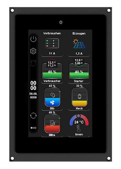 Der System Monitor PSL informiert auf seinem 5” Farb-Touchscreen auf drei verschiedenen Seiten über alle zur Verfügung stehenden Daten der elektrischen Anlage. Auf der Informationsanzeige werden die Batterie-, Tank-, Temperatur- und Bilgeninformationen dargestellt. Die Energie-Seite informiert über den Status der DC und AC Anlage. Auf der Steuerungsseite können die Hauptschalter und die Verbraucher geschaltet werden.