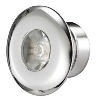 IP65 AISI 316 Aus Edelstahlguss, hochglanzpoliert, Lichtabdeckung aus Polykarbonat. 12/24 V / 0,3 W LED-Abstrahlwinkel: 25° LED-Anzahl: 1 Ø Einbauloch: 25 mm Ø außen: 40 mm Ausladung: 3 mm