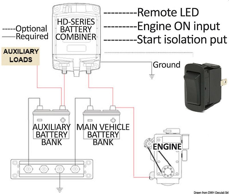 Verbindet die Batteriebänke (Start + Dienste), während die Lichtmaschine / das Ladegerät läuft, und trennt die Bänke, wenn das Ladesystem stoppt.