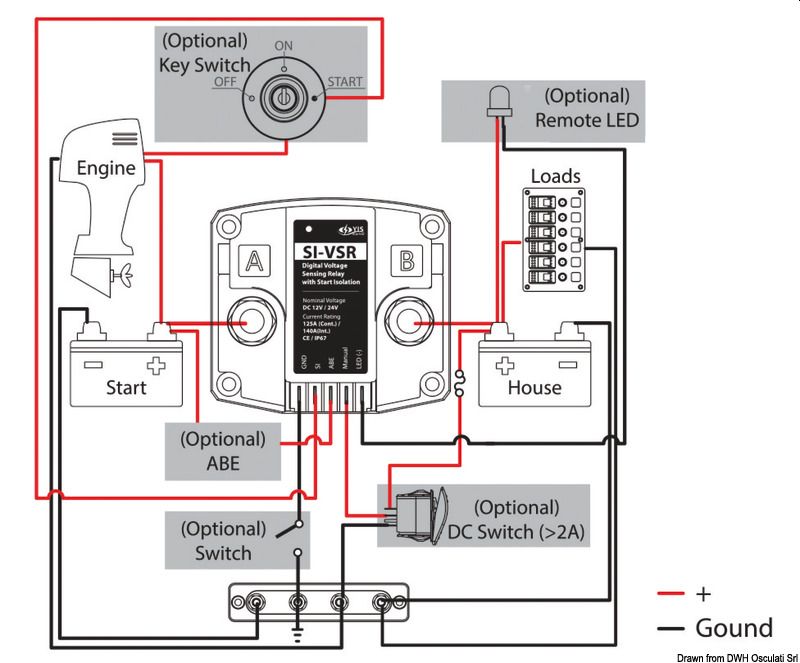 Wenn die Spannung bei abgestelltem Motor unter 12,8/25,5 V fällt, öffnet es den Kontakt und trennt die beiden Batterien, so dass nicht die falsche Batterie entladen wird.