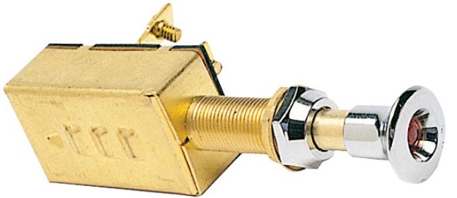 Aus verchromtem Messing, Kontakte versilbert. Design wie bei Schalter 14.918.01/2/5/6. Auf dem Schalterkopf integrierte Leuchtanzeige. Kontrollleuchte: Rot Hals: 11,5 × 24 mm Spannung: 12 V