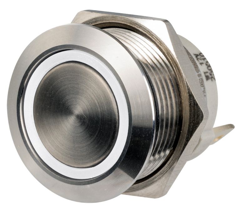 Vandalismusgeschützte FLAT-Schalter mit AISI 316 Edelstahlgehäuse, gefertigt mit CNC. Kompatibel mit 12V und 24V Anlagen und haben eine Kapazität von 20A. Schutzgrad IP67. LED-Leuchtkranz in 3 verschiedenen Farben. Verfügbar in Varianten mit Standard ON-OFF und mit momentanem ON. Montierbar auf Oberflächen mit einer maximalen Dicke von 8 mm.