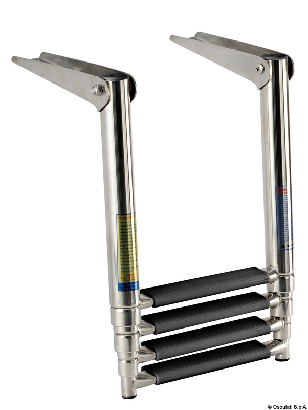 Material: Edelstahl AISI 316, hochglanzpoliert Stufen: 4, schwarz Rohrdurchmesser: 19/25/32/38 mm Maße: 1156 × 315 × 6 mm (aufgeklappt), 394 mm (zugeklappt) Gewicht: 3,50 kg
