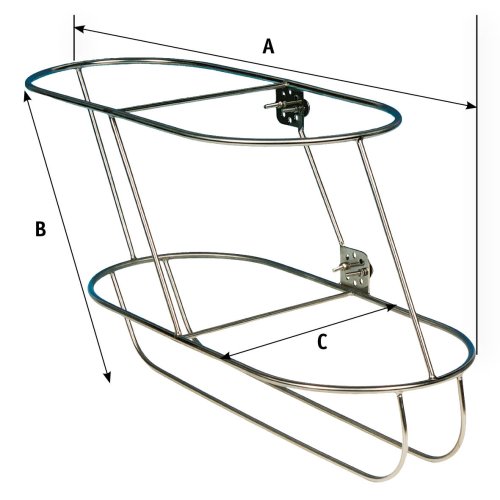 NIRO Fenderkorb, schräges Modell für 2 Fender (links), Geeignet für 2 Fender, Schräges Modell Abmessung A 650mm Abmessung B 330mm Abmessung C 240mm Modell Comet 4, links Material Niro 316 Komplett mit Befestigungsbügel für Ø25 und Ø30mm Reling