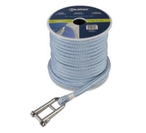 100% Polyester Fall mit angespleißtem Schäkel Großsegelfall mit D-Schäkel Edelstahl AISI 316 /A4 Farbe: blau/weiß ø: 12mm Länge: 36m Bruchlast: 2300daN