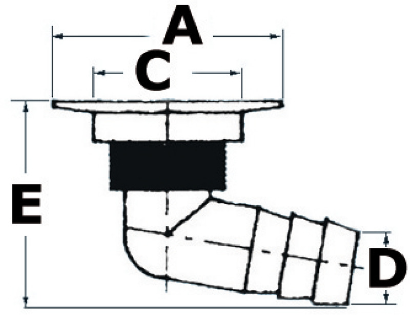 Technische Daten: Ø Flansche (A): 68 mm Ø zu bohrendes Loch (C): 50 mm Ø Schlauchhalter (D): 38 mm Maximale Ausladung (E): 90 mm