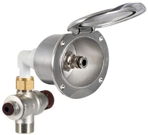 Bei Verwendung der Kaiwasseranlage wird der Druck durch ein innovatives und kompaktes System mit Druckregler und einstellbarem Messing-Rückschlagventil auf 3 bar reduziert, um die Leitungen nicht zu beschädigen. Der Wasserschlauch wird mit einer für Gartenschläuche üblichen Anschluss in den Kaianschluss eingerastet (Art.-Nr. E3618902). 3/4" BSP-Ausgangsgewinde. Gehäuse aus Edelstahl AISI 316 und selbsthaltende Klappe.