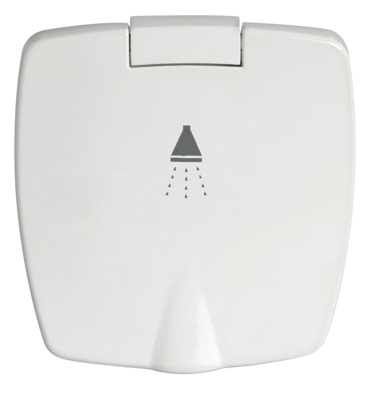 Dusche aus Kunststoff mit verchromtem Kopf. Einbaugehäuse aus UV-beständigem ASA. Deckelbeschichtung: weiß mit weißem Einbaugehäuse Einbau: Ø70x40,5 mm Ausladung: 88x95 mm