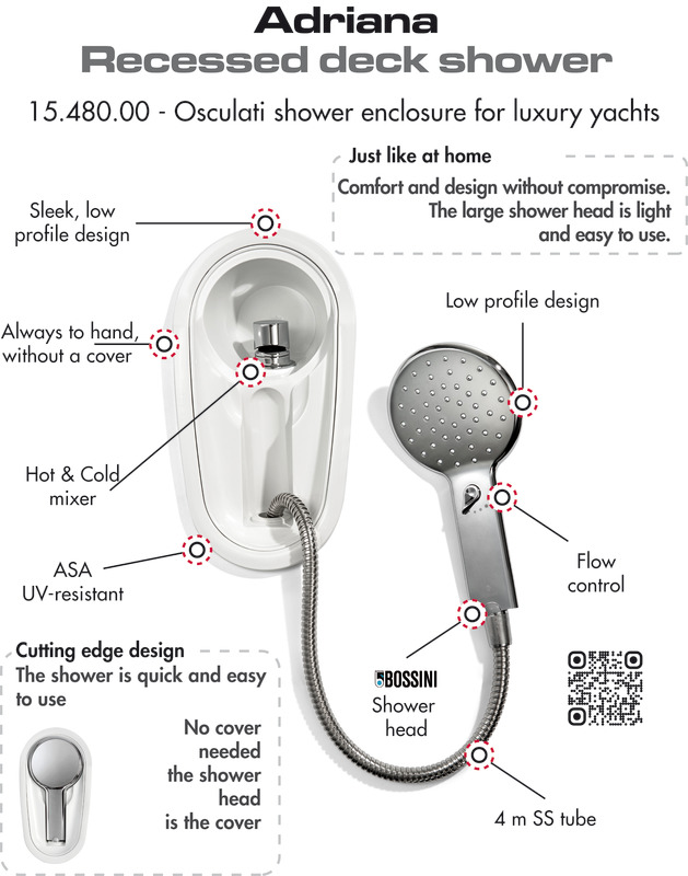 Delux Deckdusche für Luxusboote. Mit großem Duschkopf (Modell Bossini) mit einstellbarem Wasserstrahl und Kalt-Warmwasser Mischbatterie. Einbaugehäuse aus UV-beständigem ASA. Die Dusche kann sofort herausgezogen werden und der Duschkopf dient als Abdeckung. Ohne Deckel, dadurch besonders einfache Verwendung, zudem wird das Verklemmen des Schlauchs und dessen Beschädigung verhindert.