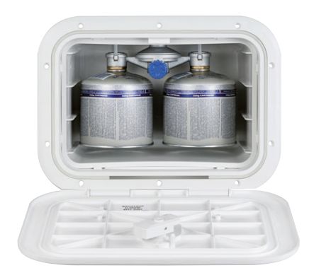 Der Staukasten ist mit einem 30-mbar-Gasregler, einem Sperrhahn und einem Doppelanschluss für zwei Gasflaschen mit