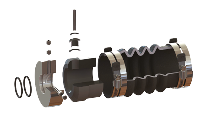 Diese mechanische Abdichtung besteht aus einem stillstehenden Karbonflansch, der gegen einen rotierenden NIRO-Ring gepresst wird durch die Spannung der Gummimuffe. Temperaturbereich: -70° bis +220°C
