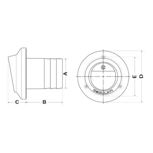Aus verstärktem Technopolymer mit Abschlussring aus poliertem Edelstahl 304. Mit verdeckten Schrauben, einfache Montage. Full Stainless Steel Design. für Rohr: Ø 75mm A: 76mm / B: 90mm / C: 35mm / D: 110mm / E: 89,5mm