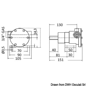Anschlüsse: 3/4" Leistung bei 2000U/min.: 46 Liter Äquivalent: Johnson F7B-8-10-24571-13 Dichtung: Gummidichtung Körper aus Bronze, Flügelräder aus Neopren, werden an den Motor angeschlossen.