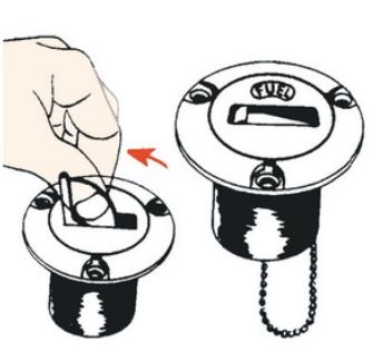 Einfüllstutzen "Utility" Aus verchromtem Messing. Das spezielle, einklappbare Öffnungssystem vermeidet die Zuhilfenahme von Schlüsseln, Münzen, Schraubenziehern usw. RINA zugelassen. Mit Wasserdrainage und Kettchen. Technical data sheet