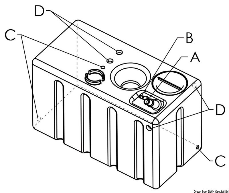 Lebensmittelechtes, lineares Polyethylen. Entspricht den RINA- und AISR-Vorgaben. Komplett mit Inspektionskappe und mehreren Anschlüssen für Einlauf, Auslauf und Entlüftung mit 1 1/4", 3/4" und 1" Innengewinde. Eine Füllstandsanzeige mit VDO 5-Loch-Flansch kann installiert werden.
