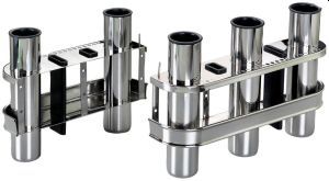 Aus rostfreiem Edelstahl, hochglanzpoliert. Schützende Gummibuchse. Maße: 343 x 235 mm Für 3 Angelruten.
