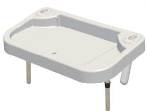 Für Köder und zum Fischausnehmen. Aus Polyethylen. Mit verstellbarer Halterung aus Aluminium und Kegelbuchse. Maße: 850 x 460 mm Version: zur Befestigung an Relingsrohren Ø 25 mm