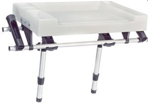 Für Köder und zum Säubern der Fische. Aus Polyethylen mit verstellbaren Halterungen aus Aluminium. Die mit kegelförmiger Buchse ausgestatteten Halterungen können in eingebaute Standard-Angelrutenhalter gesteckt werden. Maße: 670 x 470 mm