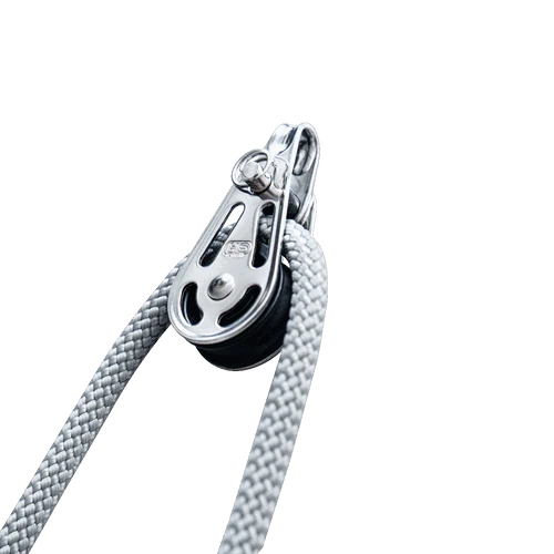 NIEDERHOLERTALJE-V-KLEMME Tauwerk: Länge 5m, Ø 6mm Blöcke: Gleitlagerblöcke Edelstahl rostfrei Arbeitslast: 175kg Bruchlast: 700kg Gewicht: 267g