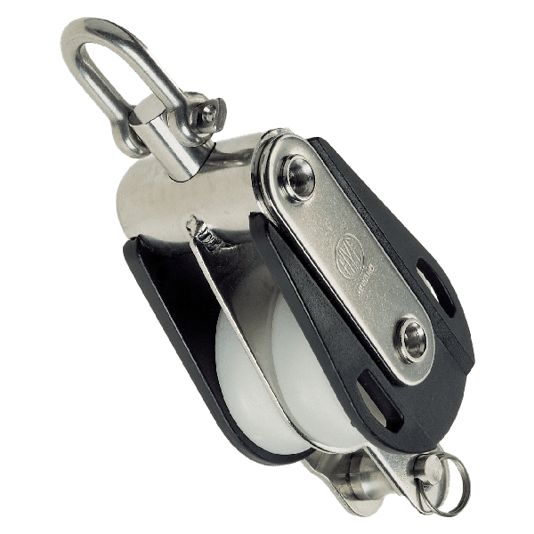 HYE Offshore Blöcke Wangen: schwarzes Spritzguss-Nylon Scheiben: solides weisses Polyacetal Gleitlager: Messing Rahmenkonstruktion: Edelstahl AISI 316 3-in-1-Wirbelkopfsyste Scheiben Ø in mm: 43 Tauwerk Ø in mm: 13 BL DAN: 1610 SWL DAN: 805