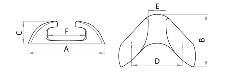 Aus Edelstahl AISI 316. Beschreibung: Bug/Heckkanten Für Tau bis zu Ø: 16 mm Optionale Bolzen: E4014210, E4014211 (M10) Maße: A: 105 mm B: 105 mm C: 31 mm D: 70 mm E: 24 mm F: 52 mm