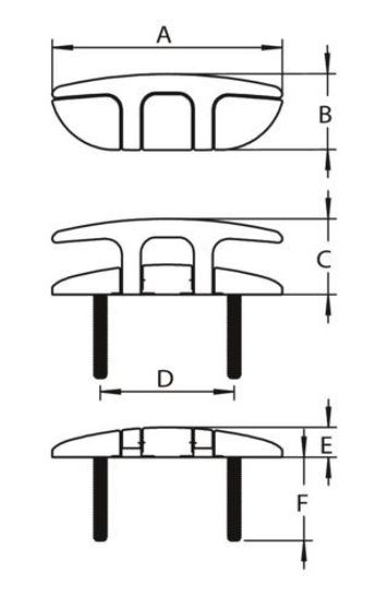 Typ: Klampe Klampen einklappbar A: 166 mm B: 55 mm C: 55 mm D: 115 mm E: 20 mm F: 52 mm Material: Edelstahl AISI 316 Besonderheit: System zur Verhinderung von Klappern Montage: Bolzenmontage Lieferumfang: Unterlegscheiben und Muttern enthalten