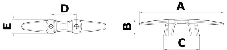 Aus rostfreiem Edelstahl AISI 316, hochglanzpoliert. A: 150 mm B: 30,5 mm C: 63,5 mm D: 45 mm E: 24,5 mm Ø Bolzen: M8