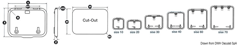 Lewmar® Serie „Ocean“ – klassische Linie, besonders solide und seit Jahren die erste Wahl bei tausenden von Booten weltweit. • Glasstärke: 10 mm • Außenmaß (L×B): 266 × 411 mm • Ohne Flansch • Ausschnitt X1/Y1: 197 × 342 mm • Radius R1: 34 mm