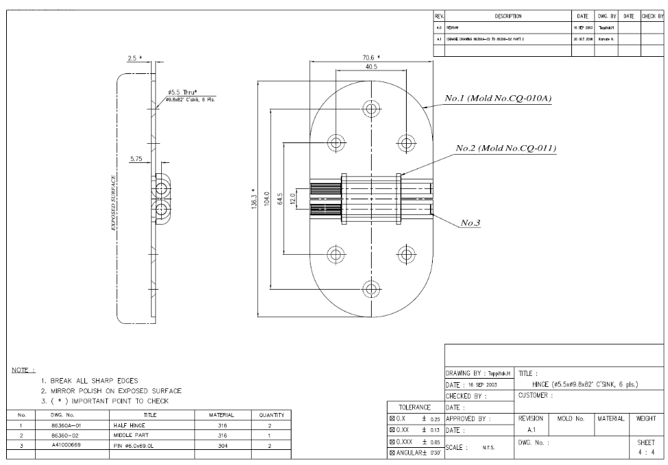 Scharnier aus hochglanzpoliertem rostfreiem Edelstahl AISI 316, für Klappen und Klapptische. Variante: mit Löcher mm: 140x70 Stärkemm: 2,8