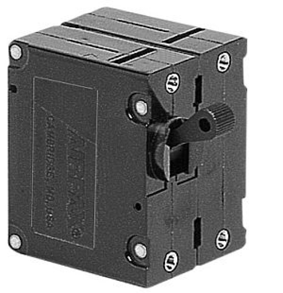 Automatischer, magnet-hydraulischer Airpax-Schalter Zweipolig, für Bordgeräte zu 80 V. Für max. 80V-Gleichstrom Maße: 19x51mm Tiefe: 42mm Befestigung mit 2 Schrauben