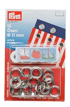 • Ösen mit Scheiben, Ø 11mm, Messing vernickelt, • 15 Stück pro Karte mit Werkzeug.