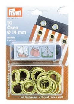 • Ösen mit Scheiben, Ø 14mm, Messing. • 10 Stück pro Karte mit Werkzeug.