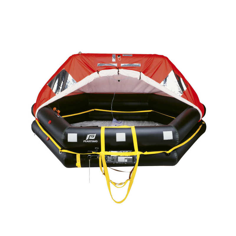 Schwimmender Anker: 0,67 m² mit 30 m Leine Aufblasvorrichtung: 1 Neoprenanzug (Isolator-Isolator): 2 (SOLAS-zertifiziert) Paddel: 2 Schwimmendes Messer: 1 Boje mit Leine: 1 Boje + 30 m Seil Ökologie: 1 Schwamm: 2 Reparatursatz: 1 Kontrollblatt und Gebrauchsanweisung: 1 Überlebensanweisungen und Signaltafel: 1 Regenwassersammler / Rinne: 1 Regenwasser-Reserve: 1 Trinkwasser (Menge pro Person): 1,5 L Lebensmittelrationen (Menge pro Person): 500 g Erste-Hilfe-Kasten: 1 SOLAS-Handleuchten: 6 SOLAS-Fallschirmraketen: 2 Signalisierender Spiegel: 1 Lampe an der Spitze des Bogens: 1 Retroreflektierende Streifen auf dem Zelt: 900 cm² Retroreflektierende Streifen auf dem Hintergrund: 600 cm² Taschenlampe (wasserdicht, étanche): 2 mit Batterien und Ersatzbirne Pfeife: 1 Rettungsinsel Austattung Technische Daten