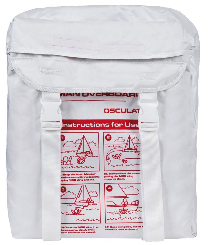 Mit Beutel und schwimmfähiger Levilene-Leine (E2240806). Wird an der Reling angebracht und enthält eine Schwimmhilfe für Notfälle. Sehr kompakt und praktischer als Hufeisenbojen. Maße: 460 x 400 x 110 mm